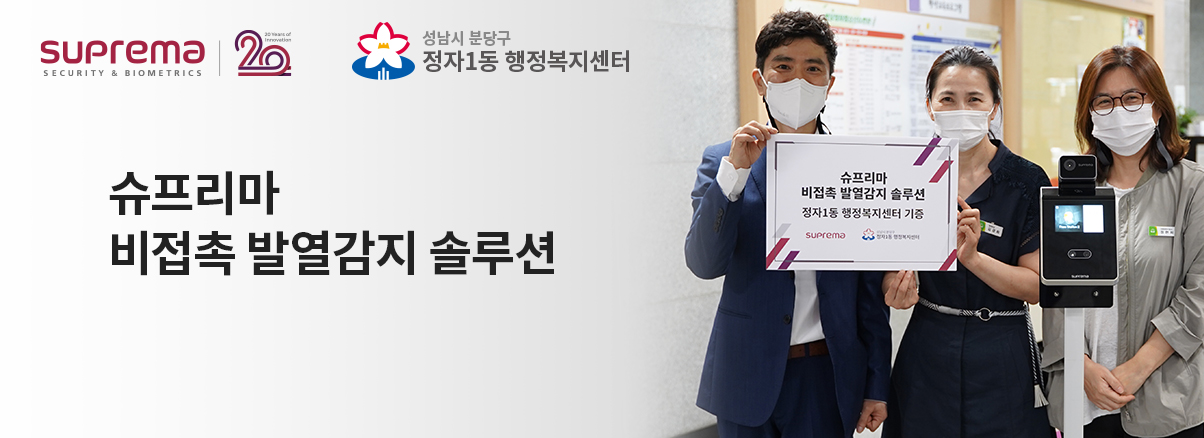 경기도 성남시 정자1동 행정복지센터 출입구와 동 건물을 사용하는 정자청소년수련관 1층 로비에 설치된 슈프리마 비접촉 발열감지 솔루션은 방문자의 피부 온도를 측정하고 자체 알고리즘을 통한 측정 정확도를 향상하여 방역에 도움을 줄 예정이다. 높이 조절기능을 이용해 성인은 물론 어린이, 유아까지 사용 가능하여 행정복지센터와 같이 다양한 연령층의 이용자가 방문하는 기관에서 편리하게 사용할 수 있다.