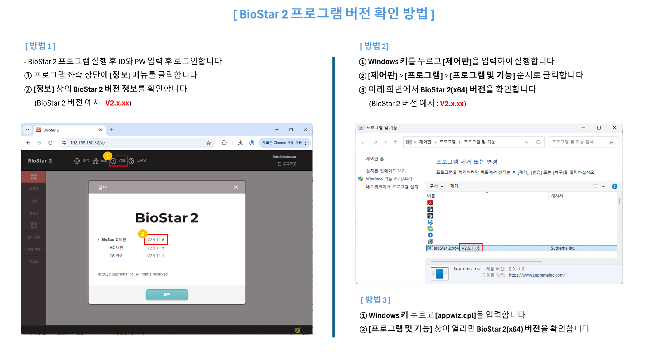 최근 Windows 10 기술지원 종료로 인해 Windows 11로 업그레이드하면서 BioStar 2 백업을 하지 않아 데이터 및 설정이 모두 삭제되는 사례가 발생하고 있습니다. 💡 업그레이드 전 반드시 BioStar 2 백업을 진행해 주세요! ✅ 백업된 파일을 다른 드라이브 또는 외장 저장 장치에 저장 필수 ✅ 백업 파일 외부 유출 방지 ✅ 복구 시 BioStar 2 버전 정보 및 DB 비밀번호 필요 1) BioStar 2 V2.9.2 이하 버전 가이드 다운로드 2) BioStar 2 V2.9.3 이상 버전 가이드 다운로드 3) BioStar2 버전 확인 방법 미리보기